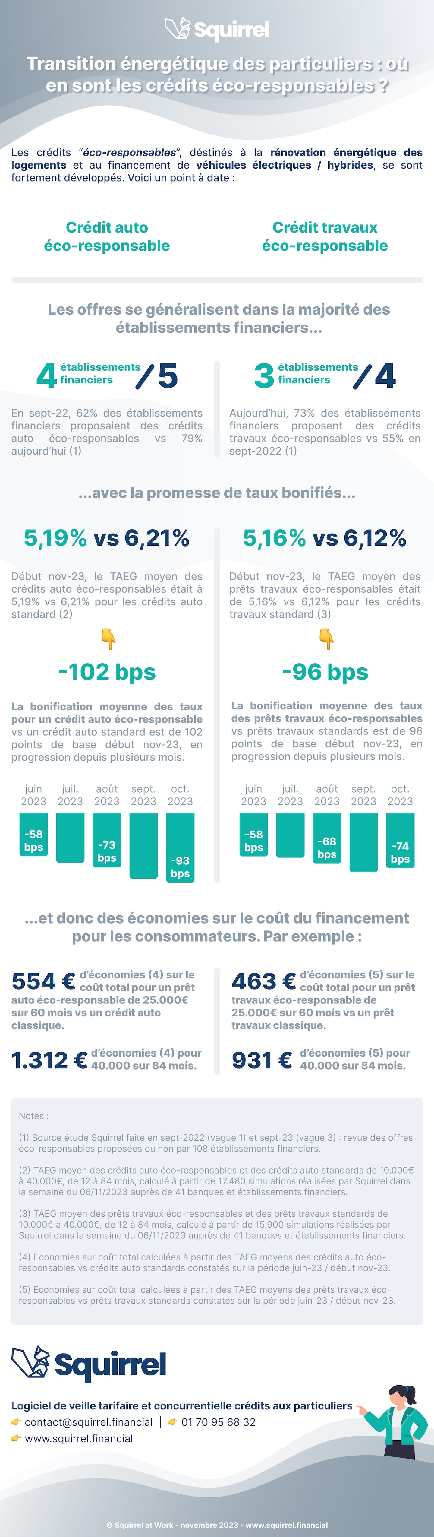 Voici l'infographie réalisée à l'issue de notre étude concernant les crédits éco-responsables et la promesse de taux bonifiés qu'ils impliquent. Vous pouvez retrouver notre analyse dans l'article "Transition énergétique des particuliers : où en sont les crédits éco-responsables ?"