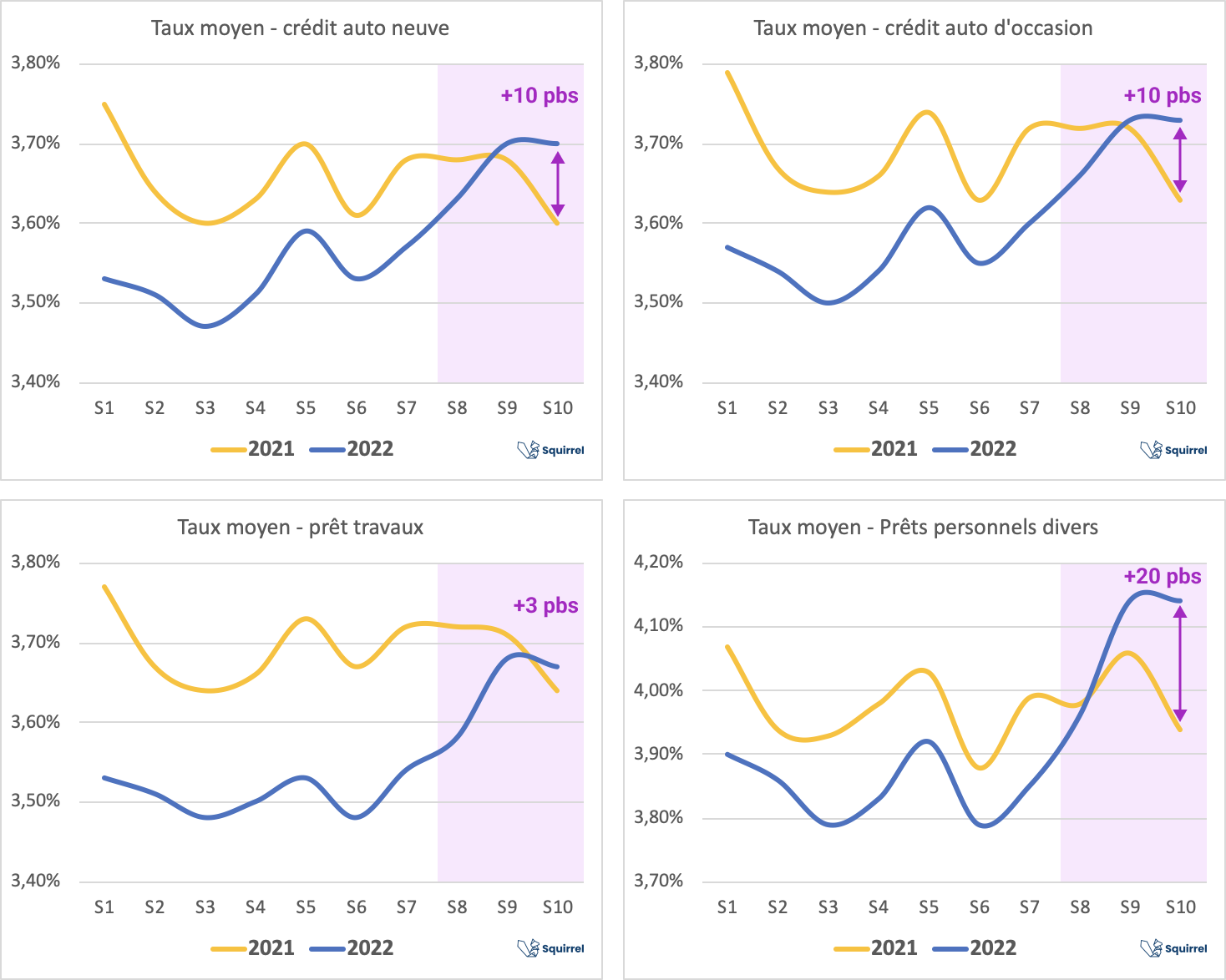 Ceci étant, les prêts travaux sont encore à un niveau très légèrement inférieur à l'année passée alors que les crédits auto et prêts personnels divers (besoins de trésorerie et projets personnels) sont à présent au dessus de leur niveau 2021.