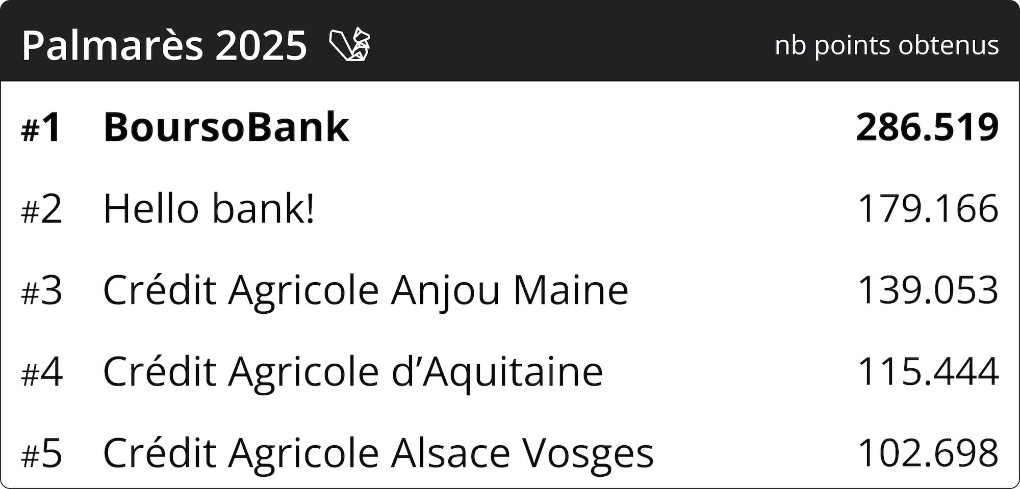 En deuxième position, Hello bank! confirme son statut d’acteur récurrent de ce palmarès, après s’être déjà classée 2ᵉ en 2021 et 2024, et 5ᵉ en 2022. En 2025, l’établissement s’est distingué par des offres particulièrement compétitives sur les prêts personnels divers, ainsi que sur les projets auto et travaux standards, lui permettant de s’installer durablement parmi les banques les mieux positionnées.