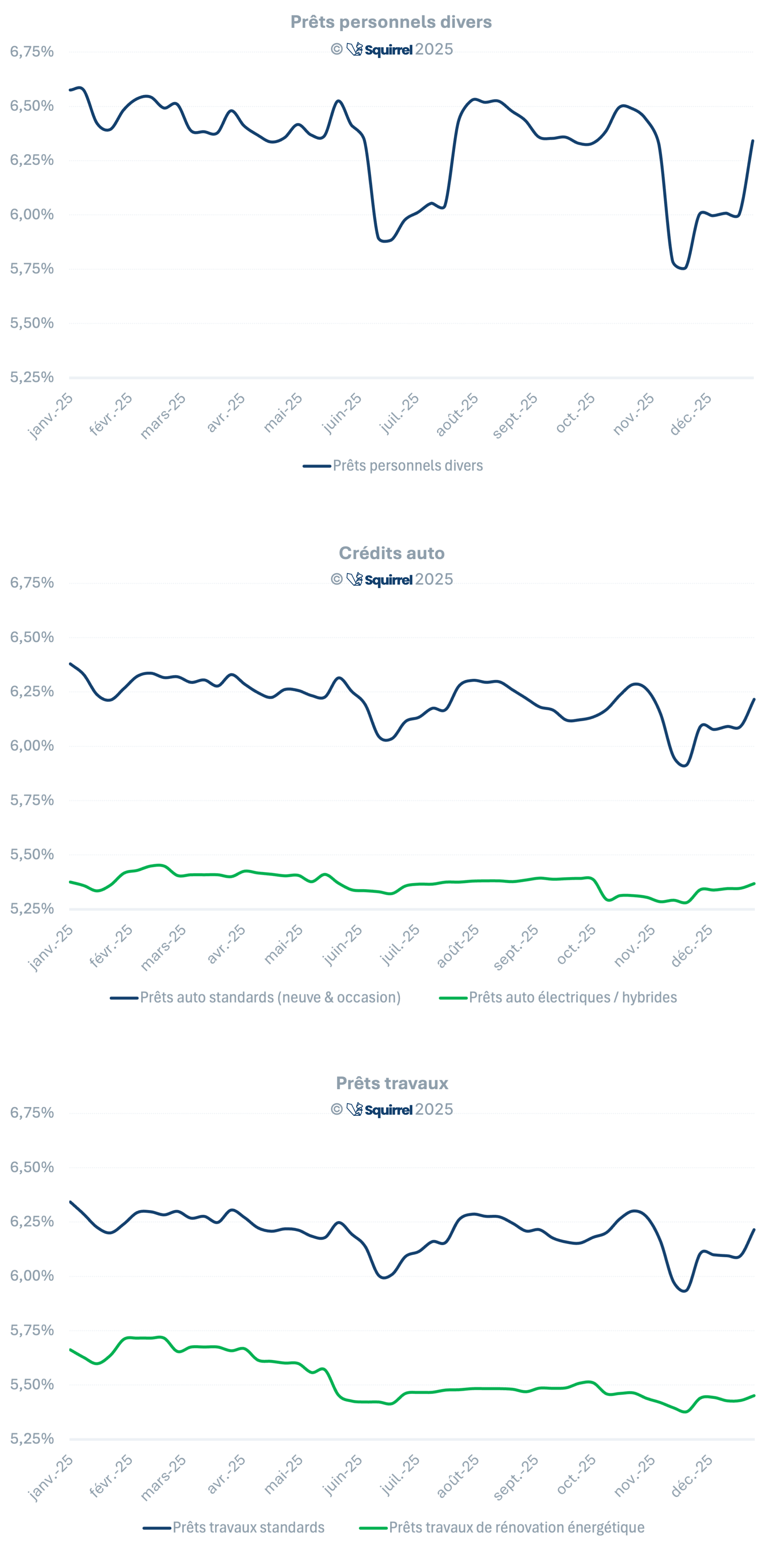 (2)  Source Squirrel.financial : TAEG moyen constaté sur les simulations de crédits véhicules neufs, crédits véhicules d'occasion, crédits véhicules électriques / hybrides, prêts travaux standards et prêts travaux éco-responsables d'un montant compris entre 7.000€ et 50.000€ sur des durées de 12 à 84 mois. Simulations réalisées entre le 01/01/2025 et le 31/12/2025.