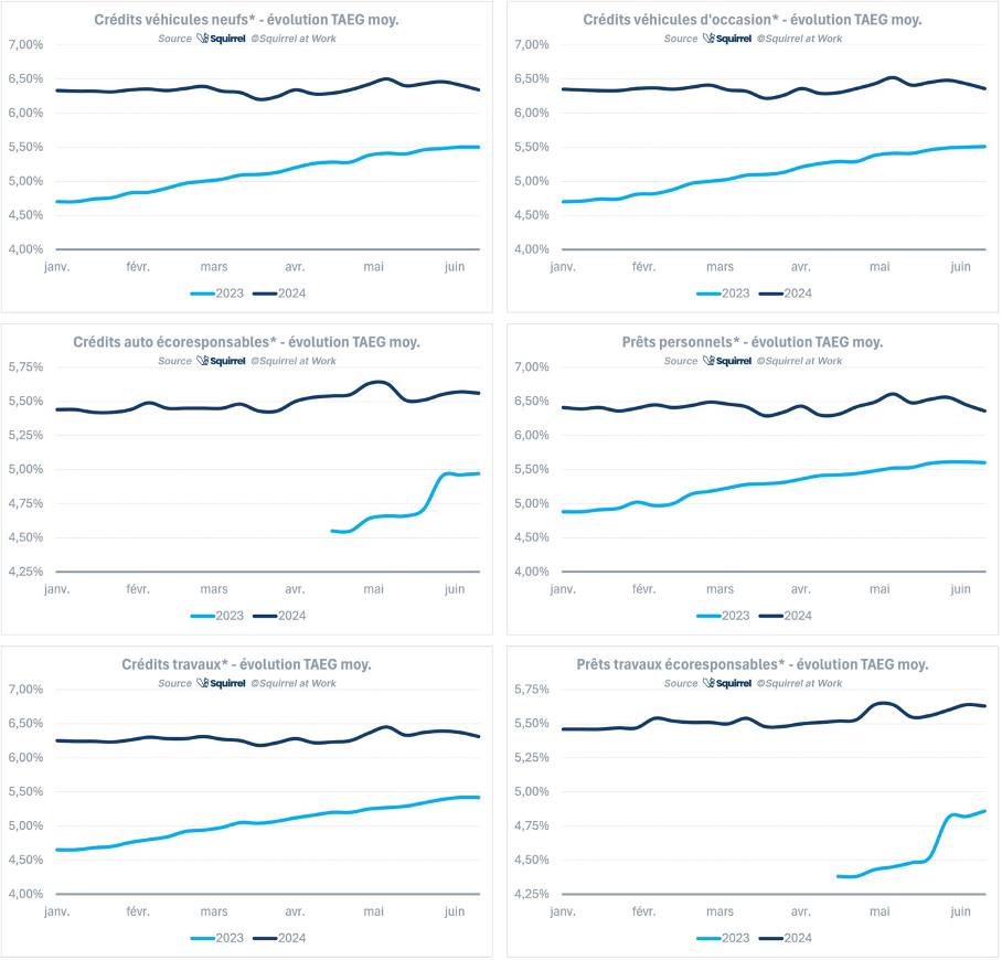 Contrairement au S1-2023 au cours duquel la hausse des taux avait été forte et constante, le S1-2024 montre une hausse très légère voir une stabilisation des taux sur l’ensemble des projets : auto, travaux ou prêts personnels divers.