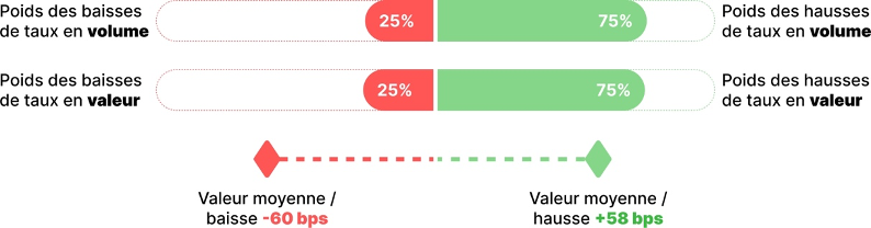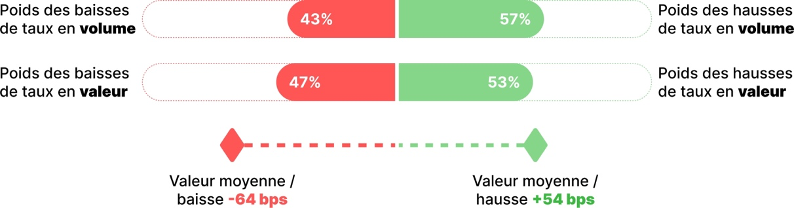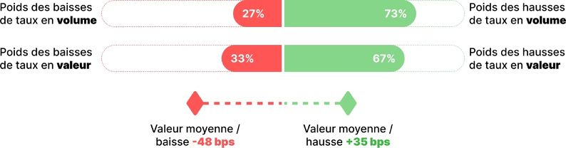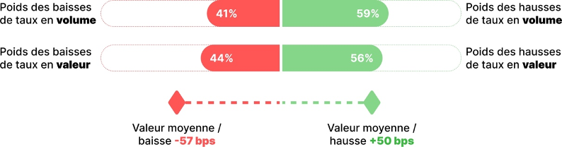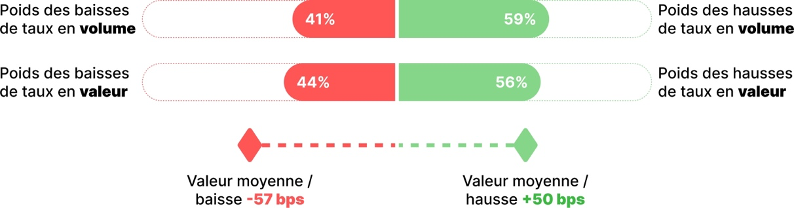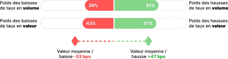 Les hausses de taux ont représenté les 3 / 4 des changements de taux aussi bien en volume qu’en valeur.