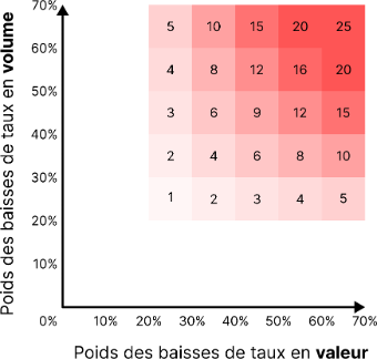 - Le poids des baisses de taux en valeur : valeur des baisses de taux en points de base pour une combinaison donnée / valeur absolue des changements de taux en points de base pour cette combinaison